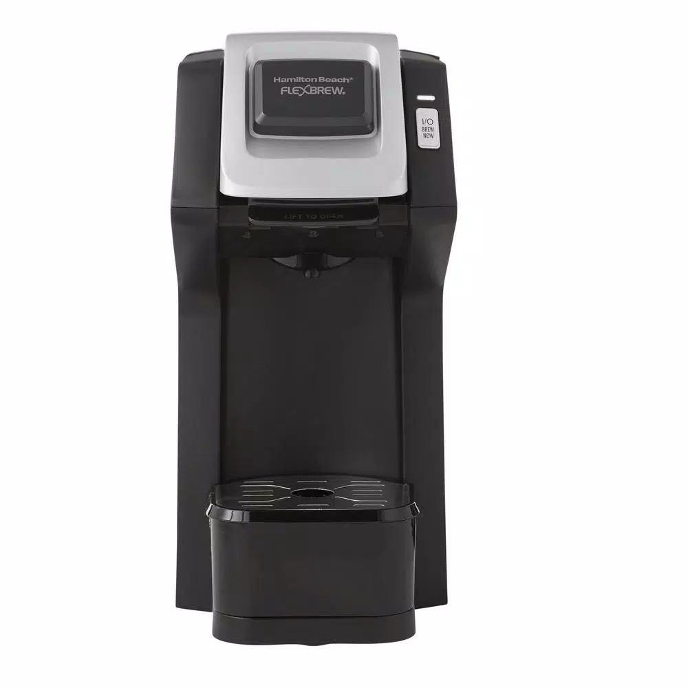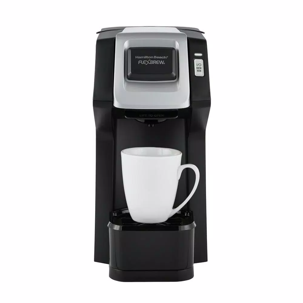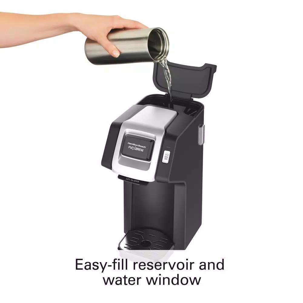 Make a personal cup of coffee with the FlexBrew Single-Serve Coffee Maker and enjoy the added flexibility of brewing freshly ground coffee and single-serve pods. With just the lowering of the lid and the press of a button, you can have a single cup of hot coffee, brewed from a K-Cup*pod or your own grounds.This single-serve coffee maker lets you brew up to 10 oz. with a single pod, or up to a 14 oz. travel mug with grounds. With an easy-fill water reservoir and water-window, theres never any confusion or over-filling. A removable cup rest doubles as a storage container to hold the brew basket or single-serve pod holder when not in use. The included grounds basket is reusable, and the single-serve pod-piercing assembly removes for easy cleaning.
