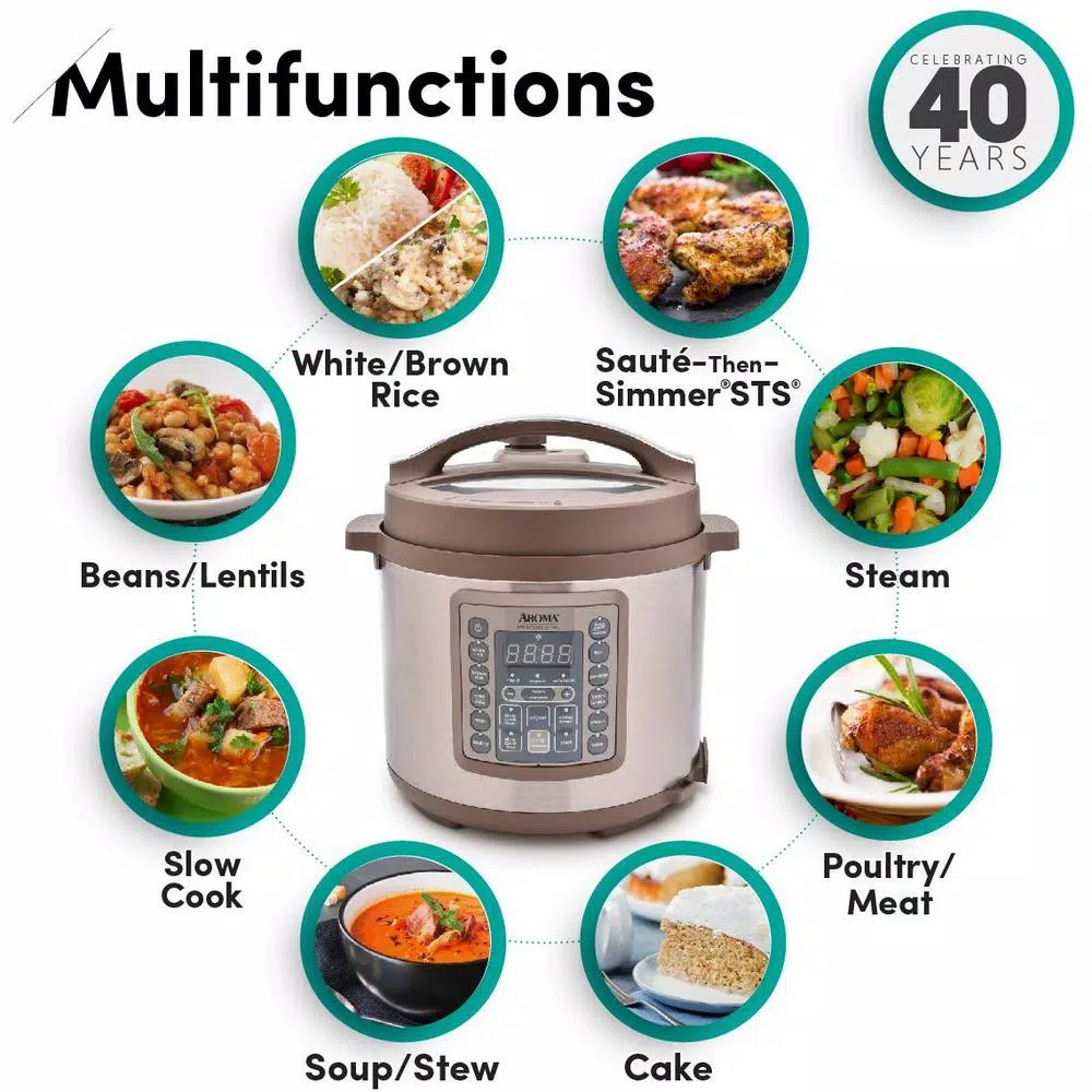 Why wait when you can cook homemade meals faster. The aroma professional 6-Quart digital pressure cooker has three different pressure settings and 14-different functions to cook meals quicker and conveniently in one pot, Simply push a button and enjoy a feast of rice, beans, meat, poultry, stew, fish and veggies. The metal steam rack and bamboo spatula means you can feel good about serving your family foods made with high and natural quality accessories. The delay timer allows you to plan cooking meals around your day and not the other way around. With so many possibilities from one small appliance, meals have never been easier.
