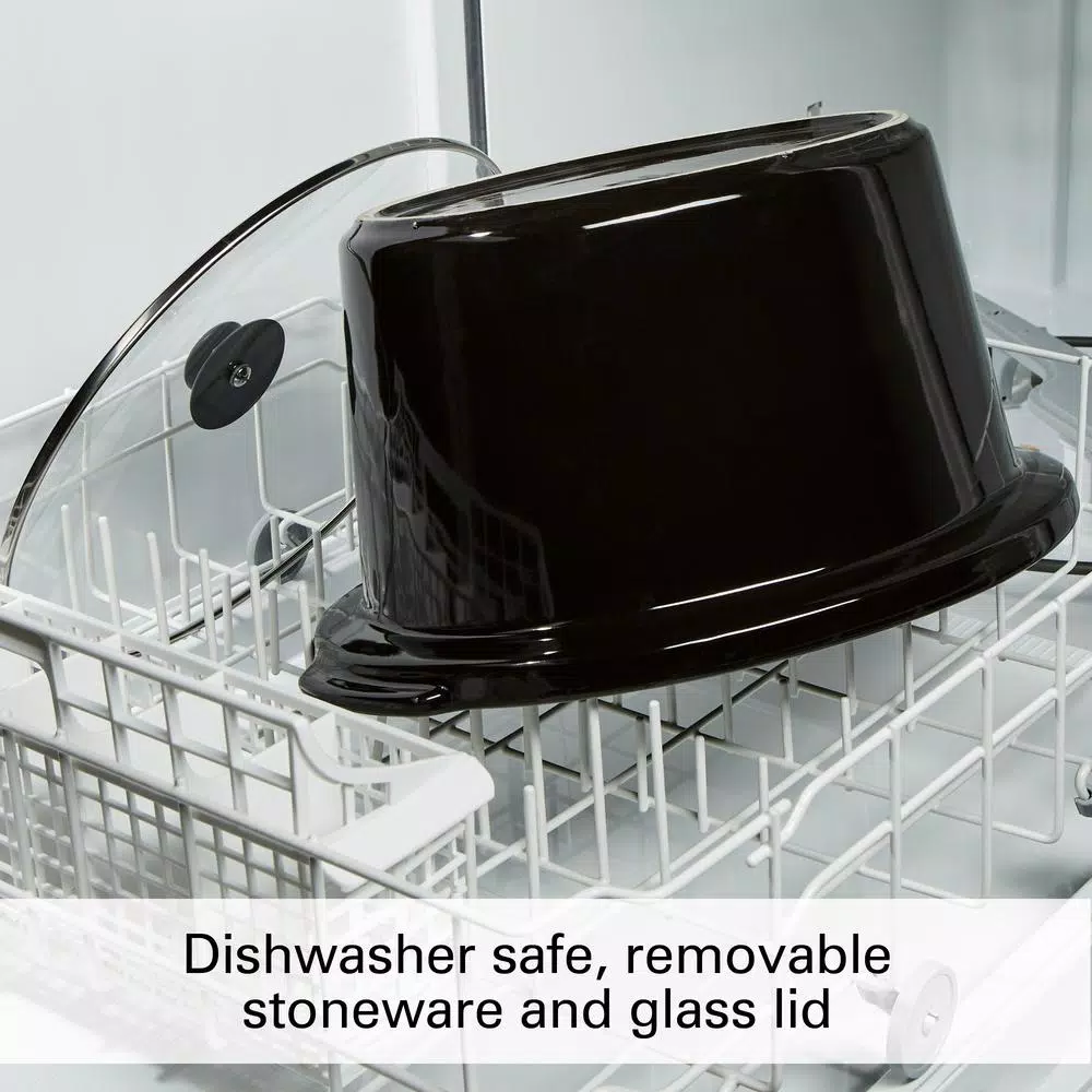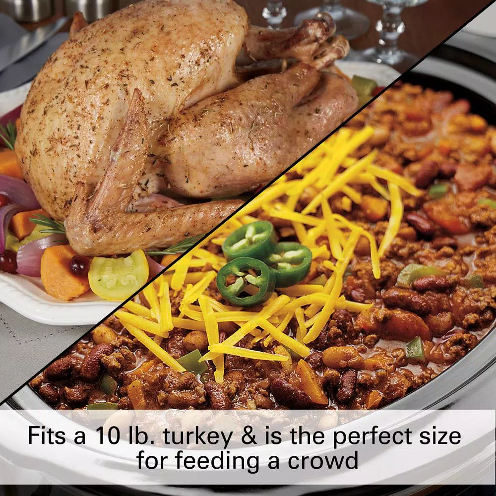 The Hamilton Beach 10 Quart Slow Cookers extra-large capacity is perfect for everything from game-day chili to your Thanksgiving turkey. The oval shaped stoneware crock can fit up to a 10 lb. turkey or 12 lb. roast and is perfect for large-batch soups and stews. This slow cooker features low and high cook settings and a warm setting, ideal for buffets or when dinner ends up later than you planned. Full-grip, folding handles make it easy to carry, and both the stoneware crock and glass lid are dishwasher safe. Extra Large Capacity This slow cooker is just the right size for feeding a crowd at a potluck, making dinner for a large family or batch cooking. The oval-shaped stoneware can fit a variety of foods, like soups, stews and even a 12 lb. roast. 3 Temperature Settings Cook your meal on Low or High; if your meal is done cooking before youre ready to serve it, switch to Warm so it maintains its temperature without overcooking. Full-Grip, Folding Handles Full-grip handles mean you can carry the slow cooker from the counter to the serving table easily. When its time to put the slow cooker away, the handles fold down for easy storage in tight spaces.