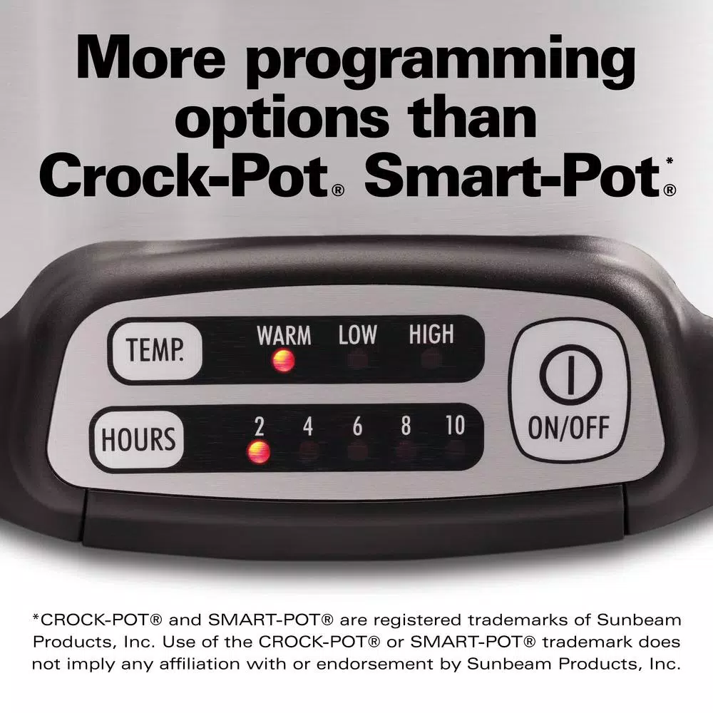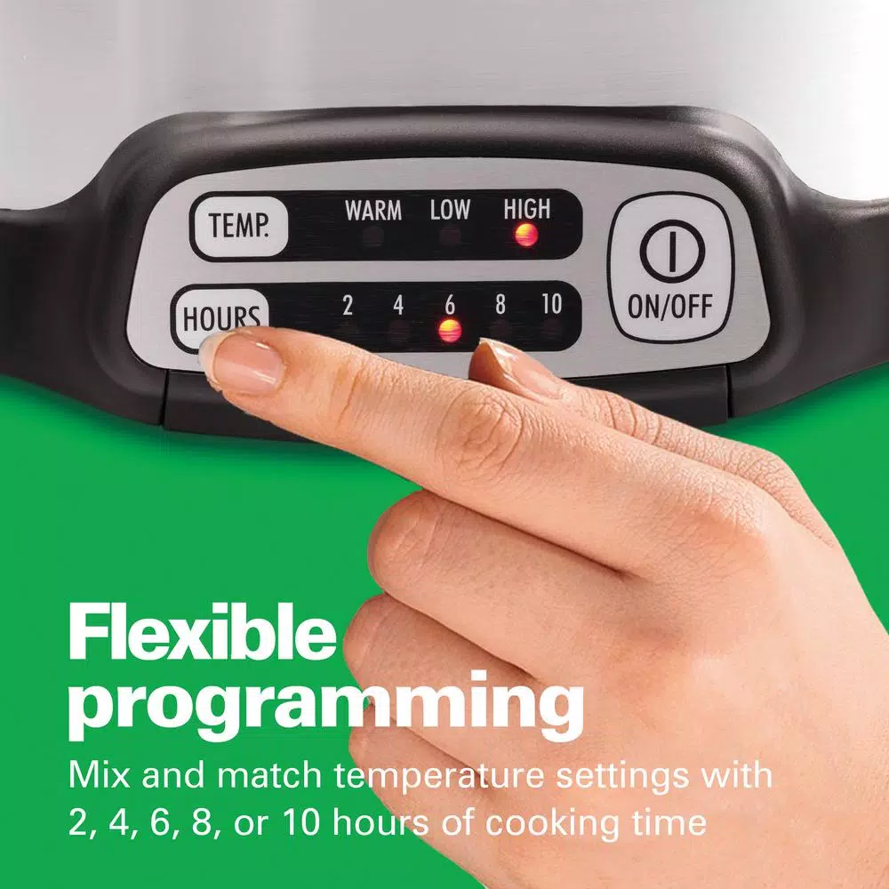 Hamilton Beach Stovetop Sear and Cook programmable slow cooker has everything you need to create homemade, delicious meals on your schedule. Sear meat on your stovetop to lock in flavor, and then finish the meal in the slow cooker. Removable nonstick aluminum pot cooks directly on gas, electric, or ceramic stovetops and is oven safe. With more programming options than a Crock-Pot Smart-Pot slow cooker, mix and match temperature settings with your choice of cooking times. Choose from 2, 4, 6, 8, or 10 hours of cooking time and high, low, or warm temperature settings. The 6 Qt. oval crock is the perfect size for a 6 lb. chicken or 4 lb. roast. Both pot and lid are dishwasher safe for easy cleanup.