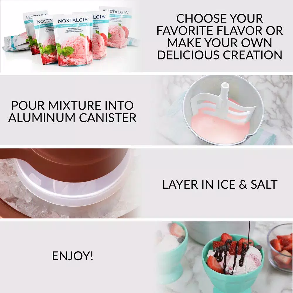 The Nostalgia ICMP600WD Vintage Collection 6 Qt. Wood Bucket Electric Ice Cream Maker with Easy-Clean Liner is a fast and easy way to make 6 Qt. of ice cream, frozen yogurt, or gelato. Featuring a locking motor mount, easy to clean plastic bucket and 6 Qt. aluminum canister. Simply add your ingredients into the aluminum canister and place in the middle of the bucket, layer with ice and salt and let the electric motor do the rest. The durable churn paddle produces delicious creamy homemade ice cream and the easy clean liner makes for easy clean up. Customize each recipe by adding extras, like strawberry preserves, cookie dough, candy pieces and more. When done, use the included lid and lid cap to store leftover ice cream in the freezer.