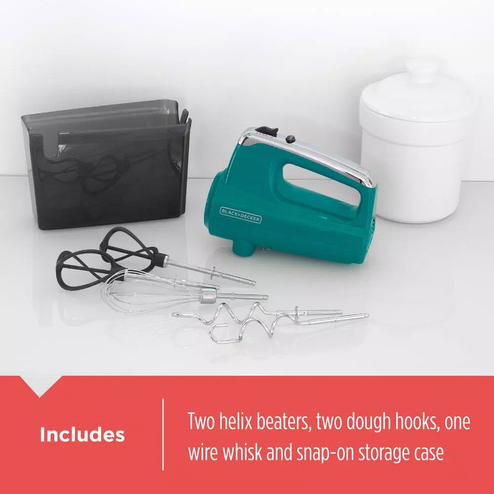 - Includes 2-helix beaters, 2-dough hooks, 1-wire whisk, and a snap-on storage case