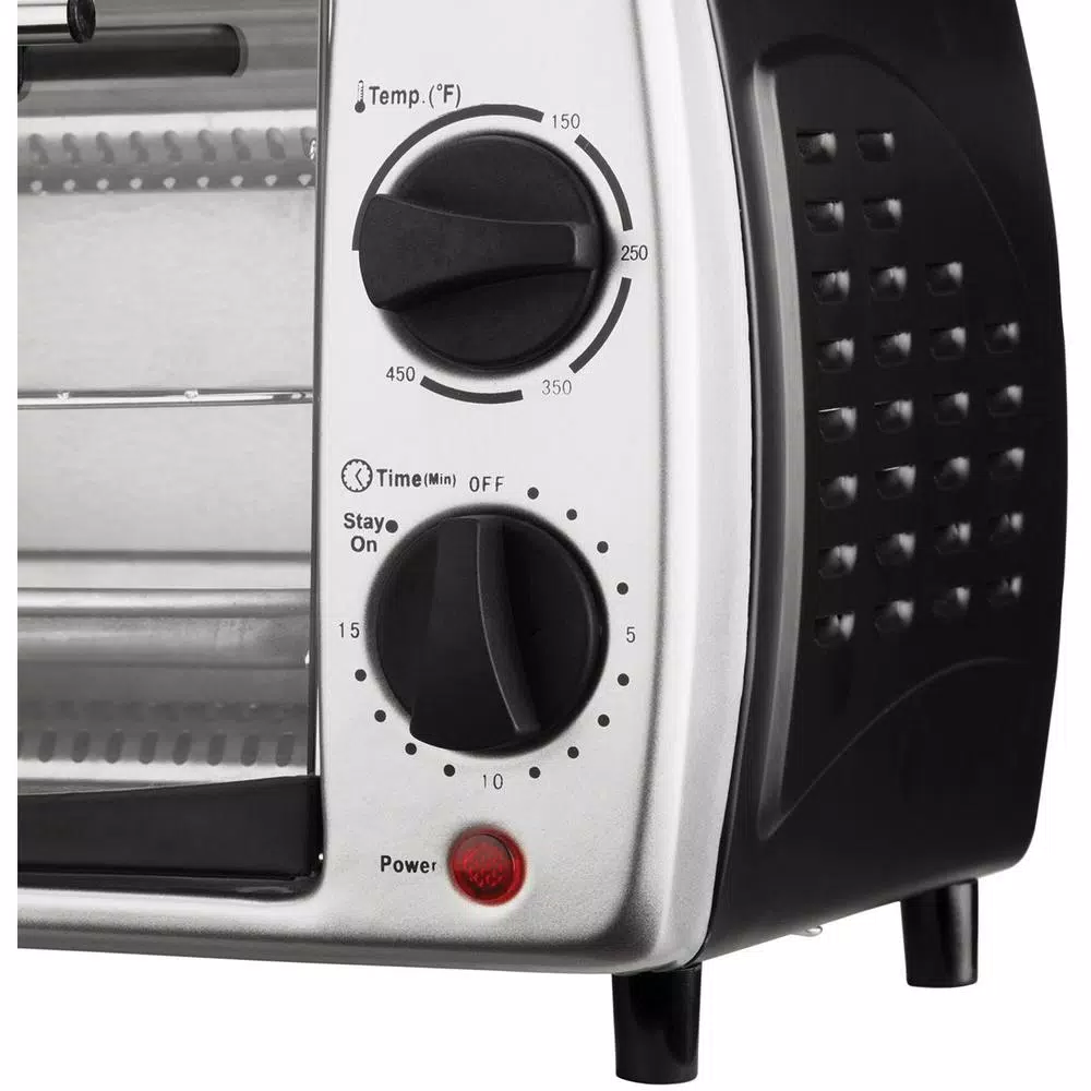 The powerful Brentwood Appliances TS-345B 4-Slice Toaster Oven and Broiler can toast, broil and bake an array of foods. Choose between the 15-minute timer with auto shutoff or the stay-on function. 2 rack positions and 2 heating elements on this black retro modern toaster oven ensure even toasting while the convenient crumb tray helps make clean up easier.