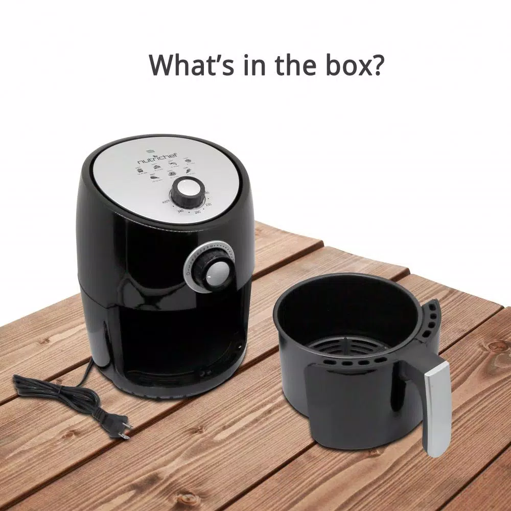 NutriChef was created on the principle that healthy home cooking should be attainable to all, regardless of skill level and economic status. Starting in 2014, we noticed the disconnect in our lives and in the lives of those around us. We were so busy, always rushing forward, and our health and personal lives suffered. We needed to find some way to slow down and put our health first, all without sacrificing convenience or taste. Could we somehow create healthier versions of our favorite foods, easily in our own kitchens? The answer was a resounding yes, and NutriChef was born. What’s in the Box: – Air Fryer – Slide-Out Frying Basket – Roasting Plate Technical Specs: – High Powered Heating Element: 1000 Watt – Temperature Settings: 180-400° Fahrenheit (82-205° Celsius) – Frying Basket Capacity: 2+ Quarts – Maximum Time Setting: 30 Minutes – Construction Material: Engineered ABS, Teflon Frying Basket – Power Cord Length: 3.3′ Ft. – Power Supply: 120V – Food Basket/Pan Size (L x H): 6.3” x 3.6” -inches – Total Fryer Size (L x W x H): 9.0” x 9.0” x 11.0” -inches